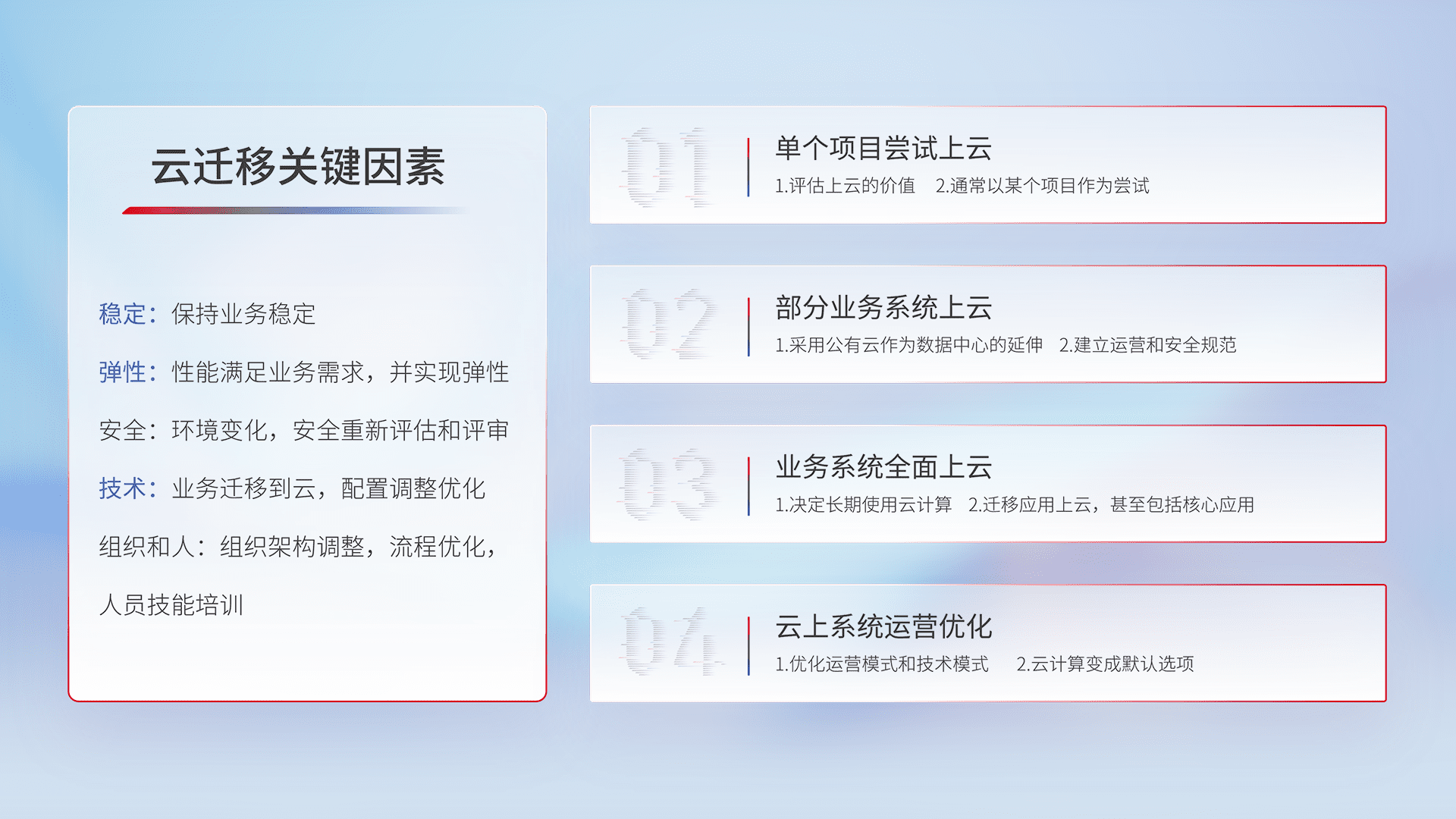 结合实际业务,,从规划设计、、、、云平台选型、、云原生改造、、、、数据迁移、、集成交付,,,迁移全过程为客户识别最佳上云路径,,做好风险识别管理,,,,设计网络架构、、、、身份权限、、安全审计合规、、、操作审计、、日志审计、、、、监控告警策略、、、多站点容灾设计等,,对云上基础设施进行整体规划,,,,提升IT治理水平,,以满足弹性、、、、高可用、、、高性能的需求。。